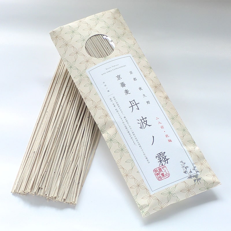 「京蕎麦 丹波ノ霧」は、<夜久野のそば>の復活をかけて近隣の農家と協力し、自社で生産した京都府福知山・夜久野産そばの実の外皮を取り除いて挽いたそば粉『丸抜き粉』をふんだんに使った雑味の少ない香り高い白地の麺に、火山灰と霧のイメージを込めて粗挽きしたそば殻を散りばめた食感もめずらしい上品に広がる甘みの中にほのかな苦みを感じられる京の蕎麦です。