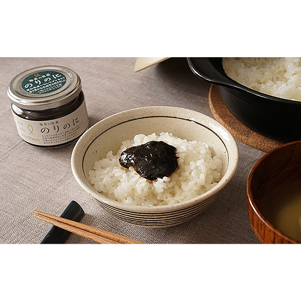 | のりのに | ひとえぐさ(国産)・醤油(小麦・大豆を含む)・海洋深層水・砂糖・みりん・水飴・はちみつ・りんご酢・米粉・いわし(富山県産)・寒天・食塩・昆布 | 熱量156kcal・たんぱく質13.5g・脂質1.6g・炭水化物21.9g・食塩相当量3.56g |