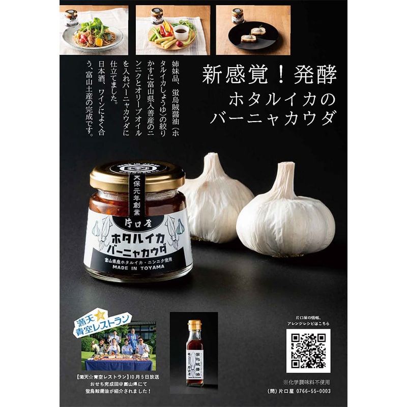 | ホタルイカバーニャカウダ | オリーブ油・ホタルイカ(富山県産)・食塩・ニンニク(富山県産) | ホタルイカ | 熱量337kcal・たんぱく質8.4g・脂質31.3g・炭水化物5.6g・食塩相当量5.5g |