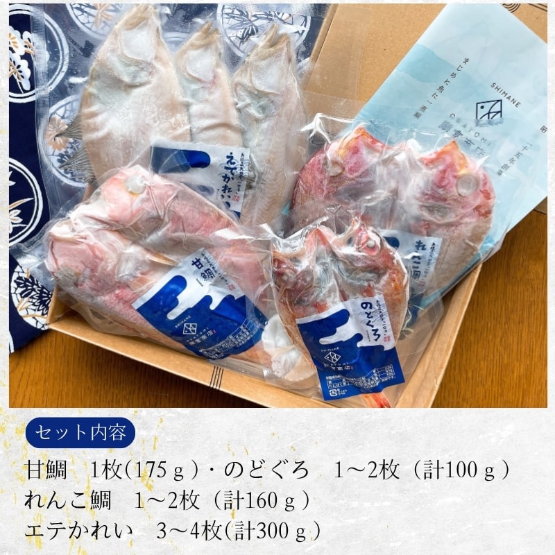 - 内容量:甘鯛1枚(175g)・のどぐろ1~2枚(計100g)・れんこ鯛1~2枚(計160g)・エテかれい3~4枚(計300g)