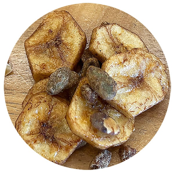 バナナチップとミックスさせることで食感を楽しめるおやつになりました。