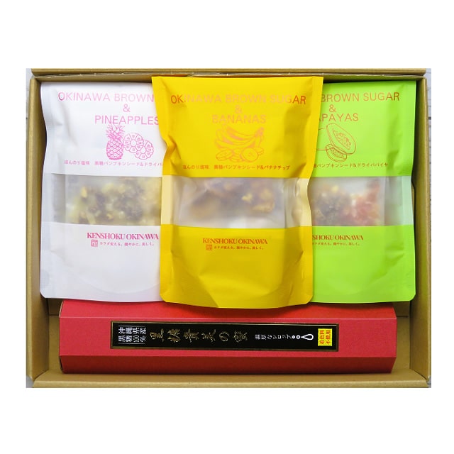<送料込>健食沖縄特選ギフトEセット(寄付額175円) *黒糖貴美の蜜と食感を楽しめるおやつに最適な黒糖パンプキンシードシリーズ3種のギフトセットです。