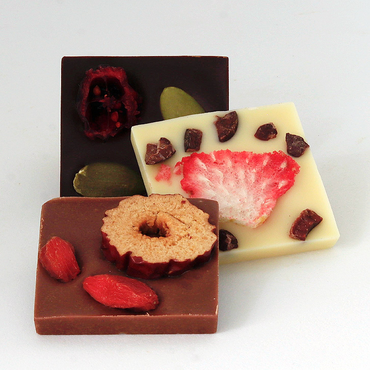 四角いチョコレートの上には、太陽の光をたっぷり浴びたナッツやフルーツ。