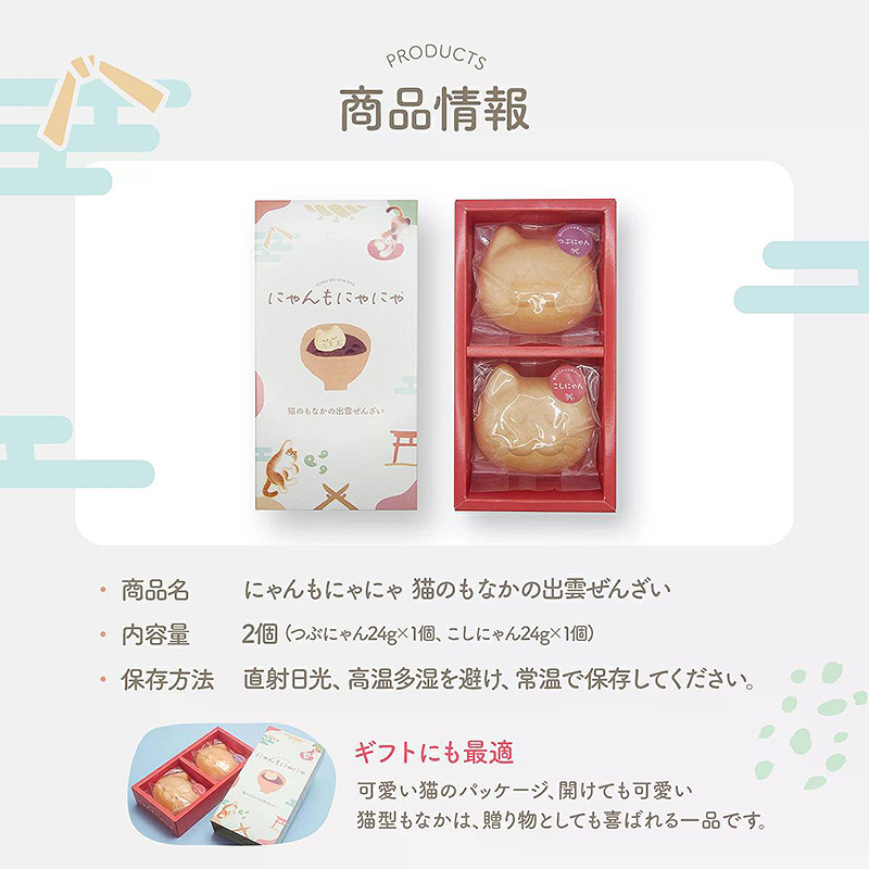 ぷっくりとしたウィスカーパッド(ひげ袋)がチャームポイントの『にゃんもにゃにゃ』に、フリーズドライのおぜんざいを閉じ込めました。
