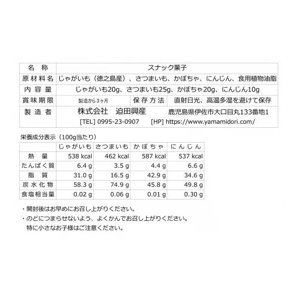 - 原材料:じゃがいも(徳之島産)・さつまいも・かぼちゃ・にんじん・食用植物油脂
